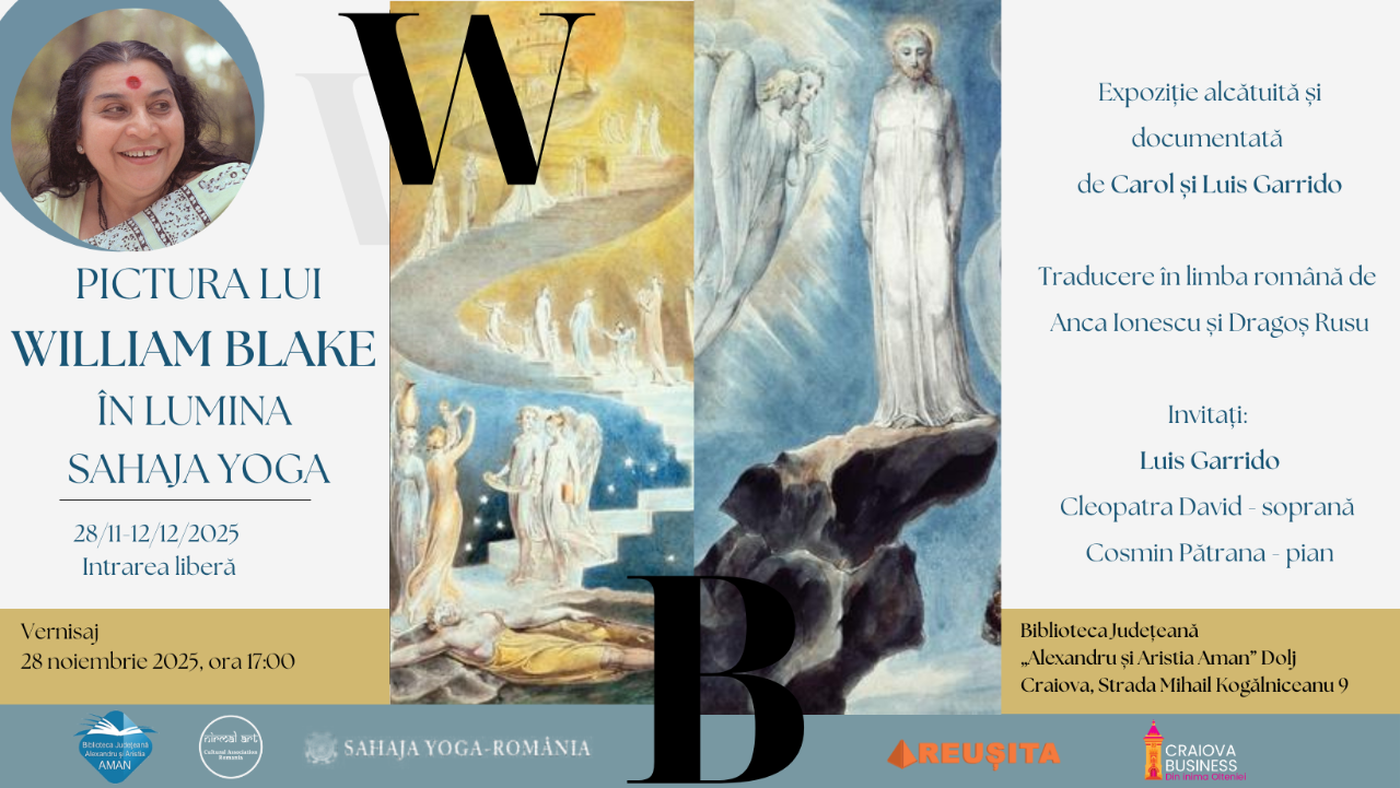 În perioada 28 noiembrie - 12 decembrie 2025, la Biblioteca Județeană „Alexandru și Aristia Aman” Dolj, va fi deschisă expoziția foto-documentară Pictura lui William Blake în lumina Sahaja Yoga, realizată de Carol și Luis Garrido (Marea Britanie). Carol și Luis Garrido au făcut timp de 14 ani o muncă de cercetare care, printre altele, a dus la descoperirea mormântului real al poetului, pictorului și profetului William Blake în 2018. Expoziția este prezentată în traducere românească și realizarea ei a fost posibilă grație SS Shri Mataji Nirmala Devi, fondatoarea Sahaja Yoga, personalitate care a promovat arta lui Blake. Vernisajul are loc pe data de 28 noiembrie (ziua de naștere a lui William Blake), la ora 17.00.